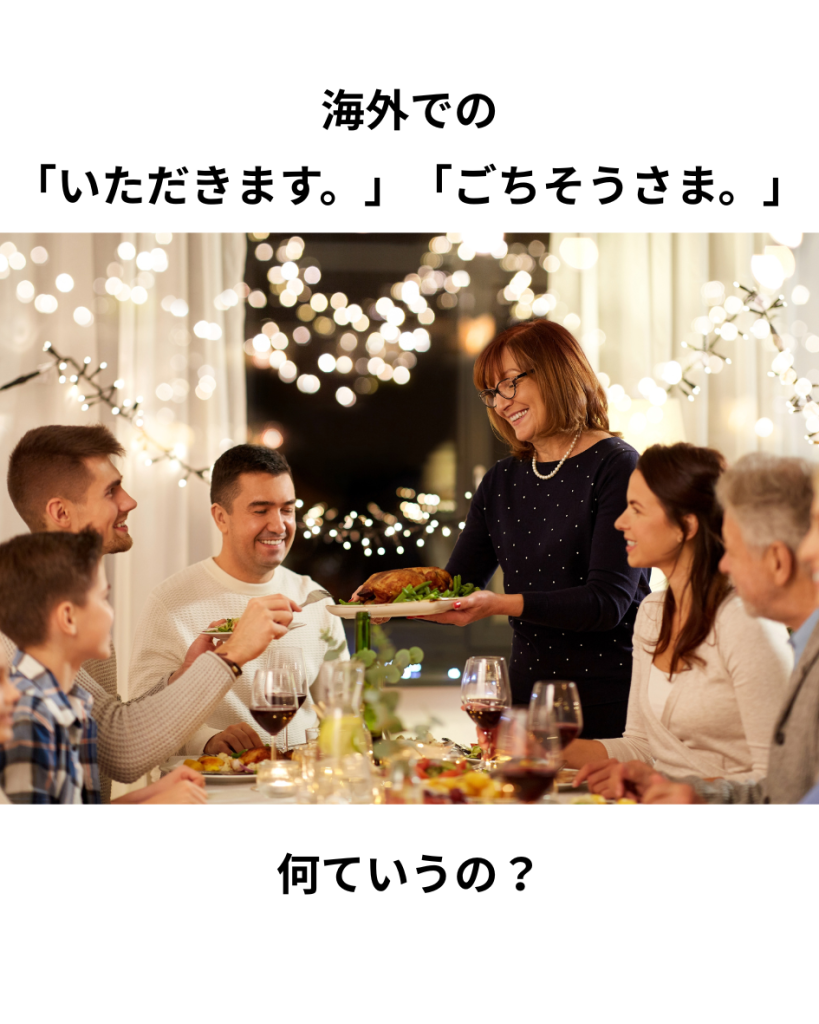 これは、日本独特な文化で海外ではぴったりと一致する一言は存在しません。代わりに、食事を始める合図や、作ってくれた人への感謝を述べる表現が使われます。