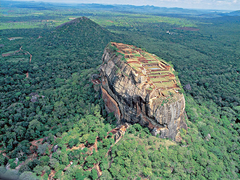 巨大な岩の上に築かれた王宮シギリヤロック。王位を奪うため、父親である王を殺害したカッサパ1世。仏教国では父親殺しは最大の罪のため、その後に逃れるようにこの地に理想郷を造ったとされます。巨大な岩の高さは約200mあり、頂上までは約1,200段の階段が続く要塞ともいえる王宮でスリランカを代表する世界遺産になってます。